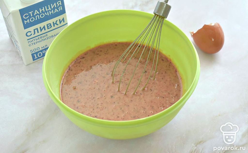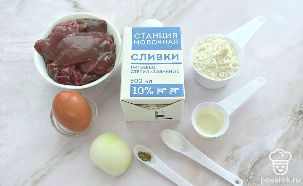 Куриную печень и лук пропустите через мясорубку. К печеночно-луковой массе вбейте яйцо, всыпьте муку и влейте сливки, посолите и поперчите. Хорошо перемешайте ингредиенты венчиком. Если тесто получилось жидким, добавьте еще немного муки.
