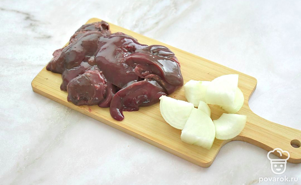 Куски куриной печени ополосните прохладной водой. Удалите прожилки и пленочки. Крупные куски разрежьте на 2 части. Лук нарежьте на ломтики.