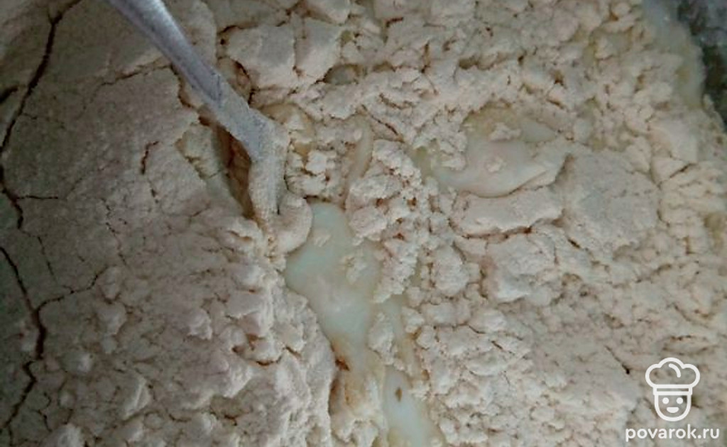 Постепенно всыпьте просеянную муку, перемешивая смесь.