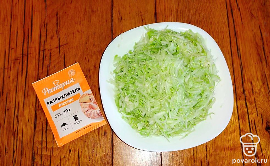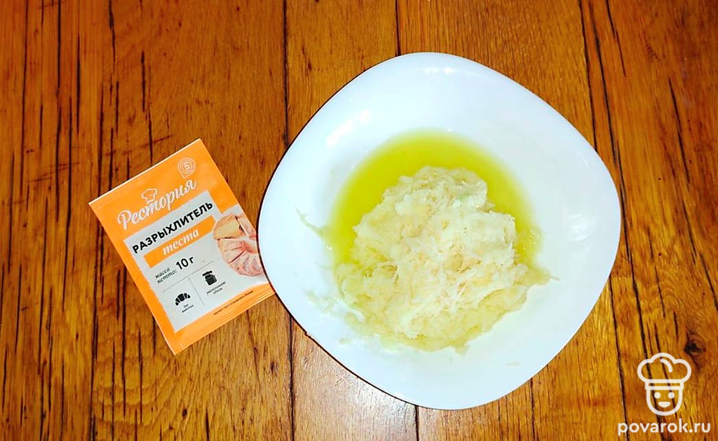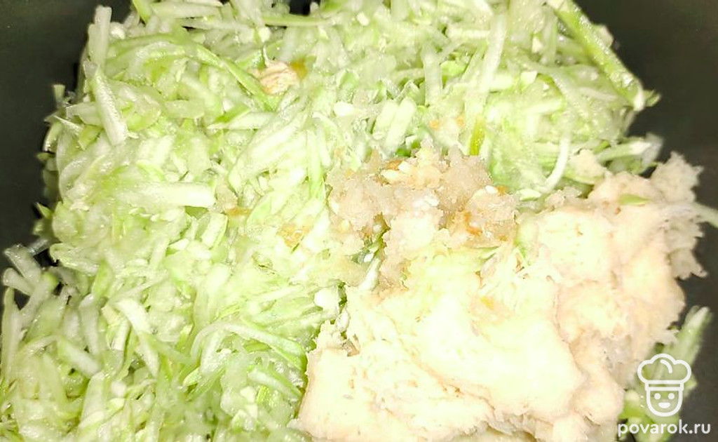 Отожмите воду из кабачка и картофеля. Сложите в глубокую емкость. Зубчики чеснока почистите и пропустите через пресс. Добавьте к овощам.