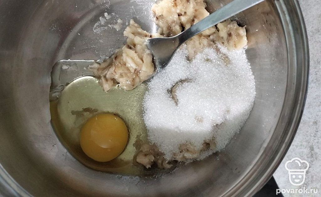 Добавьте яйцо и сахар. Тщательно перемешайте.
