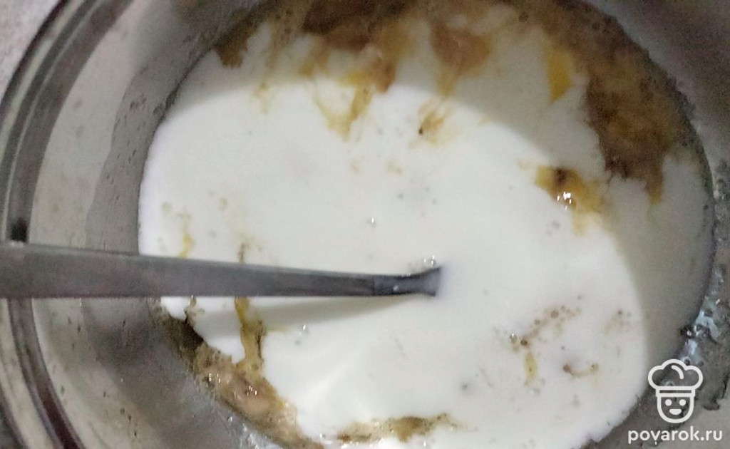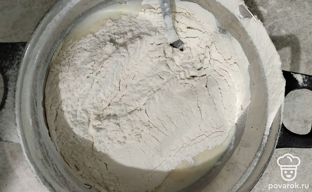 Добавьте просеянную муку и разрыхлитель теста. Перемешайте до однородного состояния.