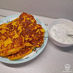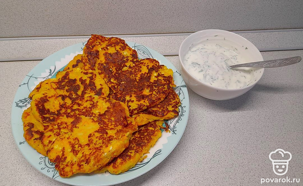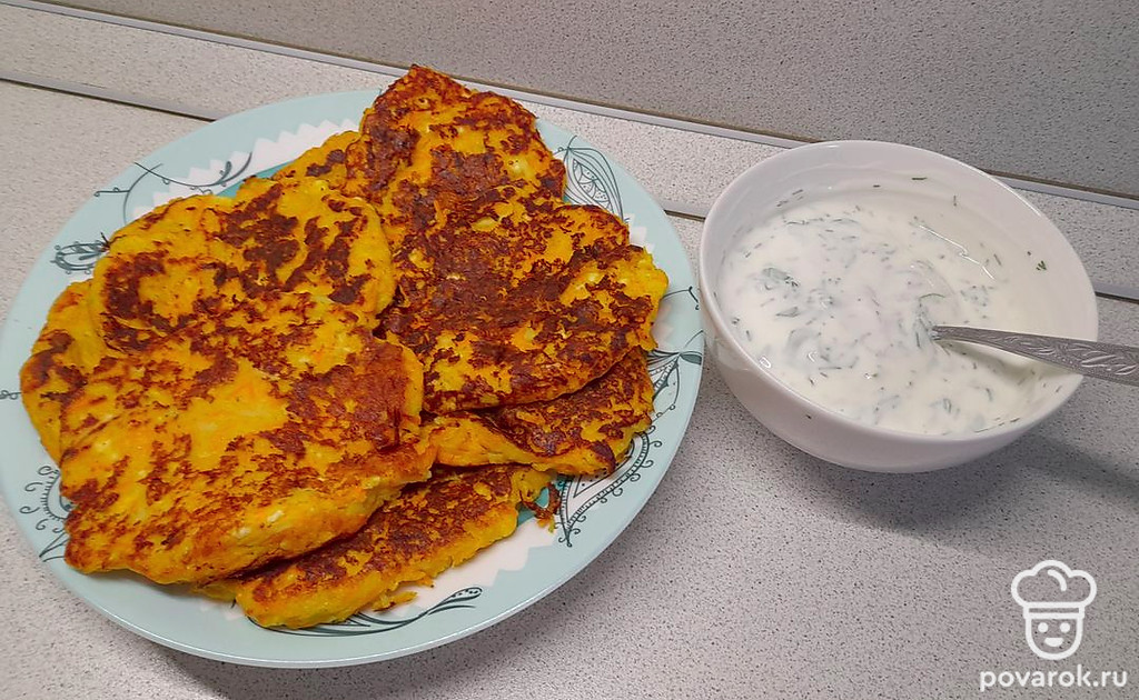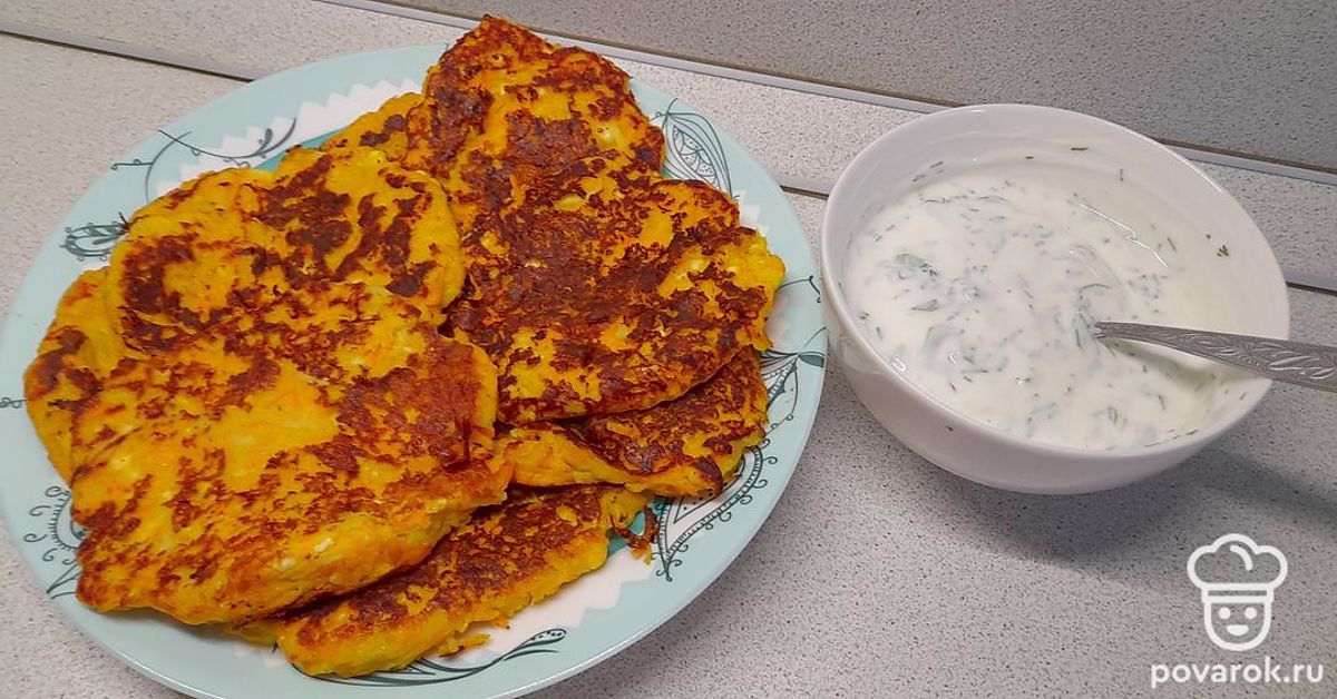 Подавайте морковно-кабачковые оладьи теплыми с соусом из йогурта и свежей зелени.