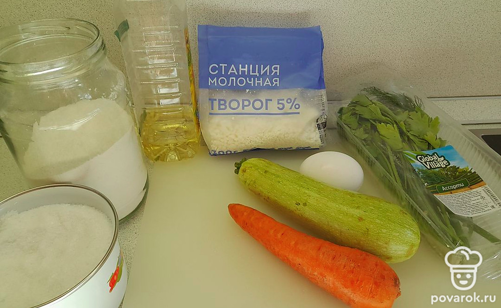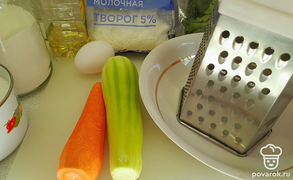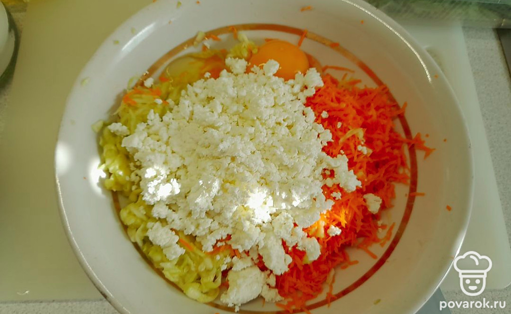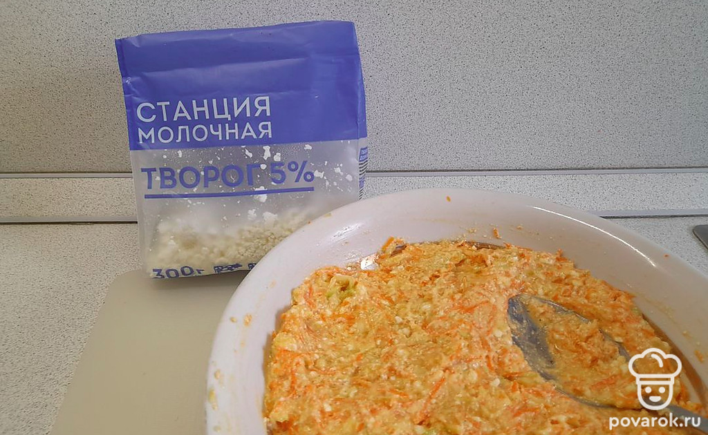 Добавьте к тертым овощам творог, яйцо, муку и соль.