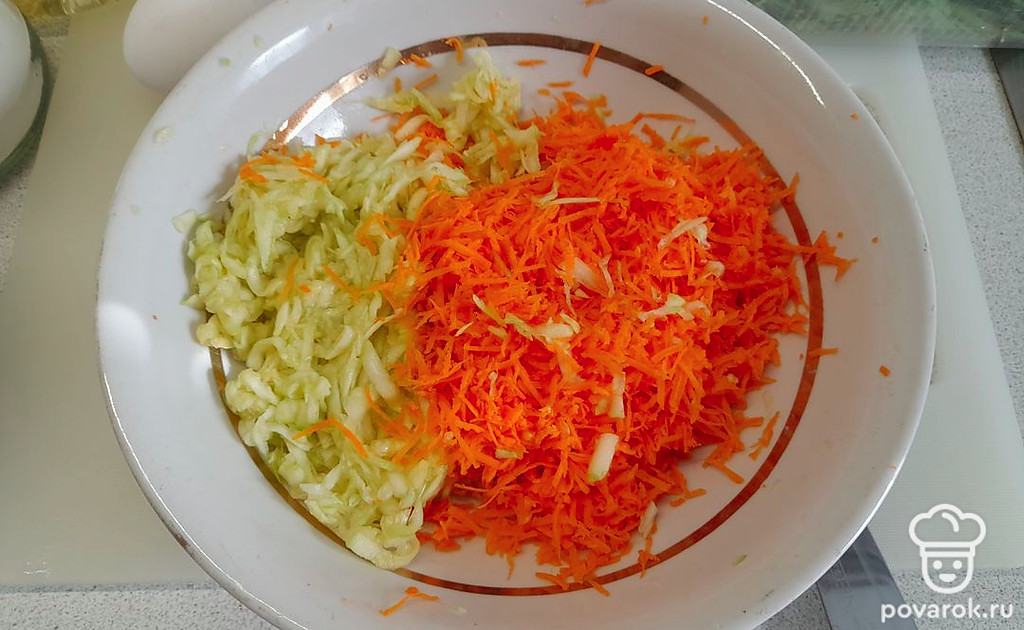 Натрите кабачок на крупной терке, а морковь на мелкой.
