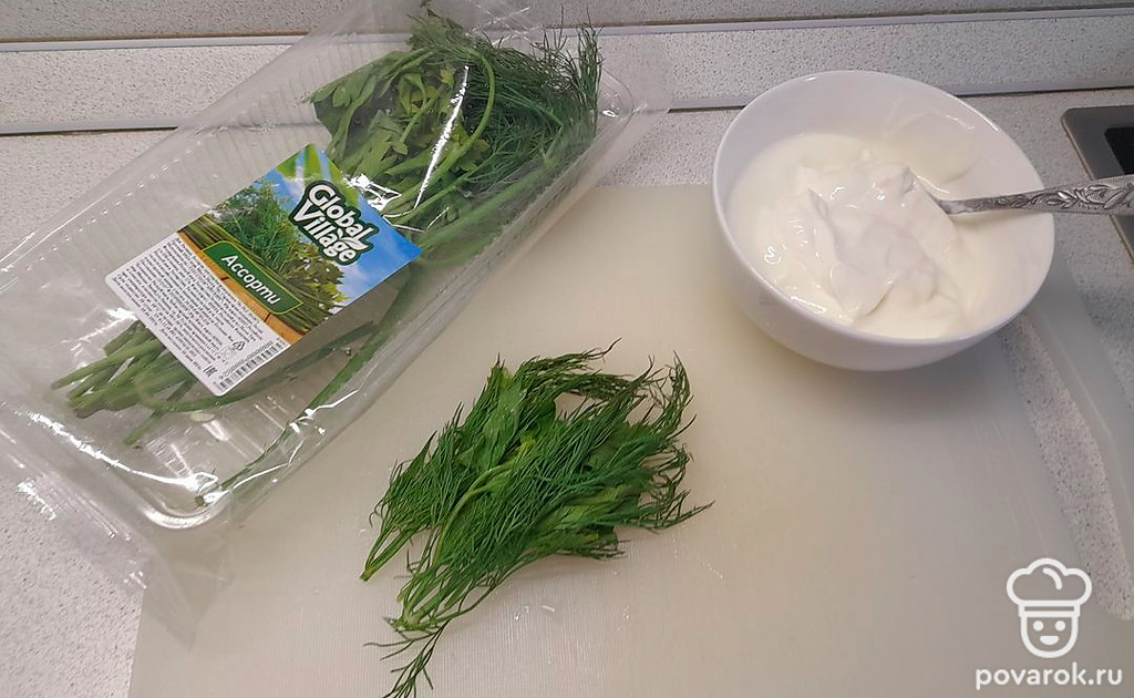 Мелко нарежьте свежую зелень и добавьте в греческий йогурт, немного посолите и перемешайте. Греческий йогурт можно заменить на нежирную сметану.