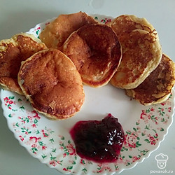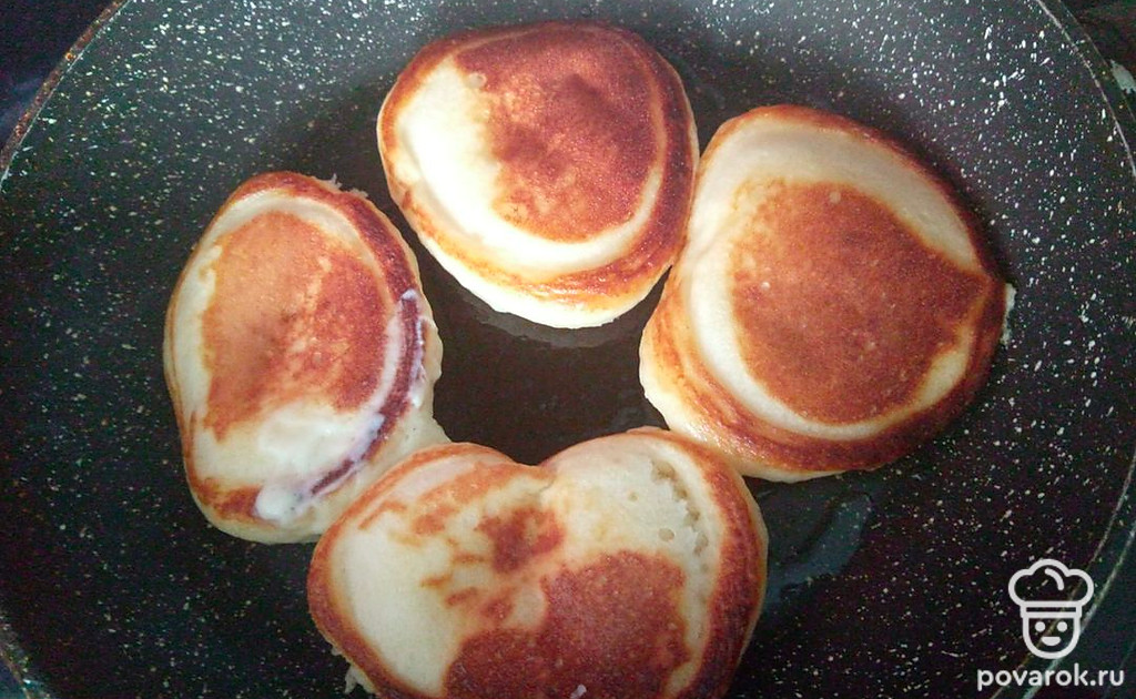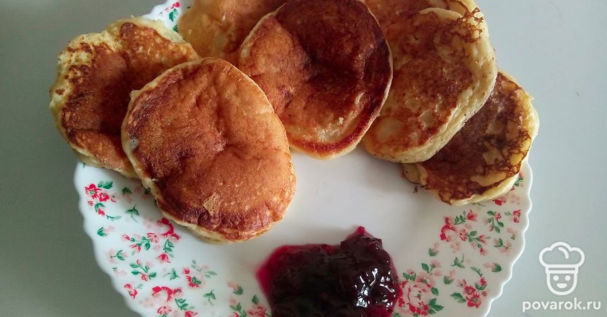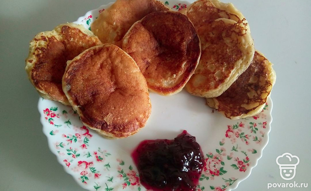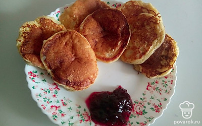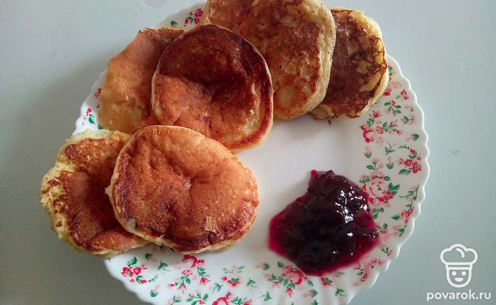 Подавать оладьи теплыми, с вареньем или сгущенкой.