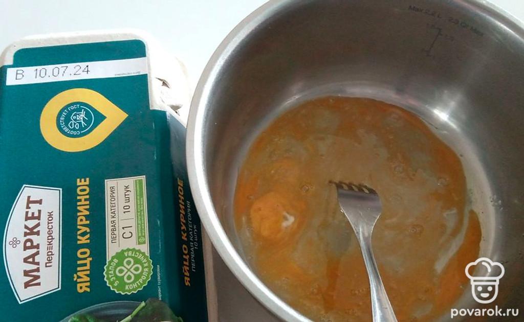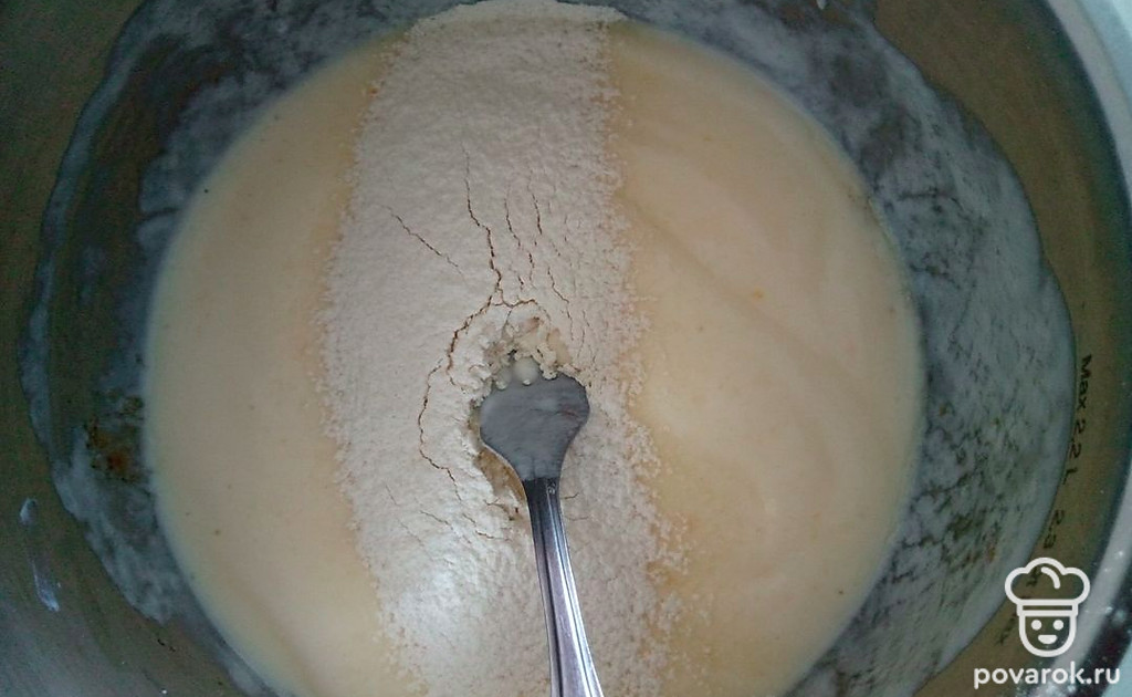 К яйцу добавить теплый кефир. Лучше достать его из холодильника заранее. Добавить просеянную муку и хорошо все перемешать.