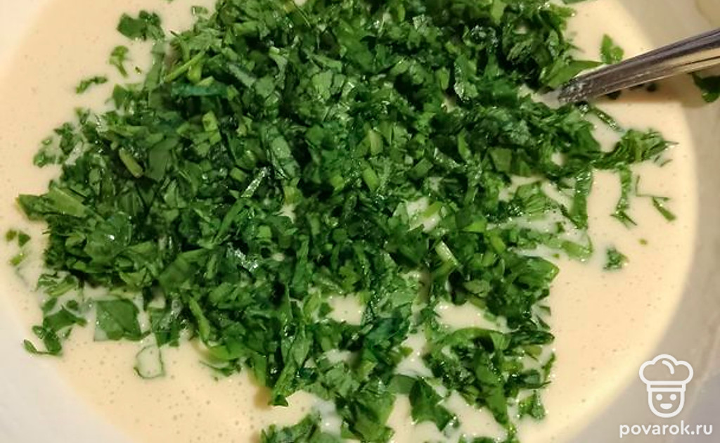 Смешать муку с молоком, добавить яйца, соду и соль, хорошо перемешать. Добавить мелко нарезанный шпинат, тщательно перемешать.