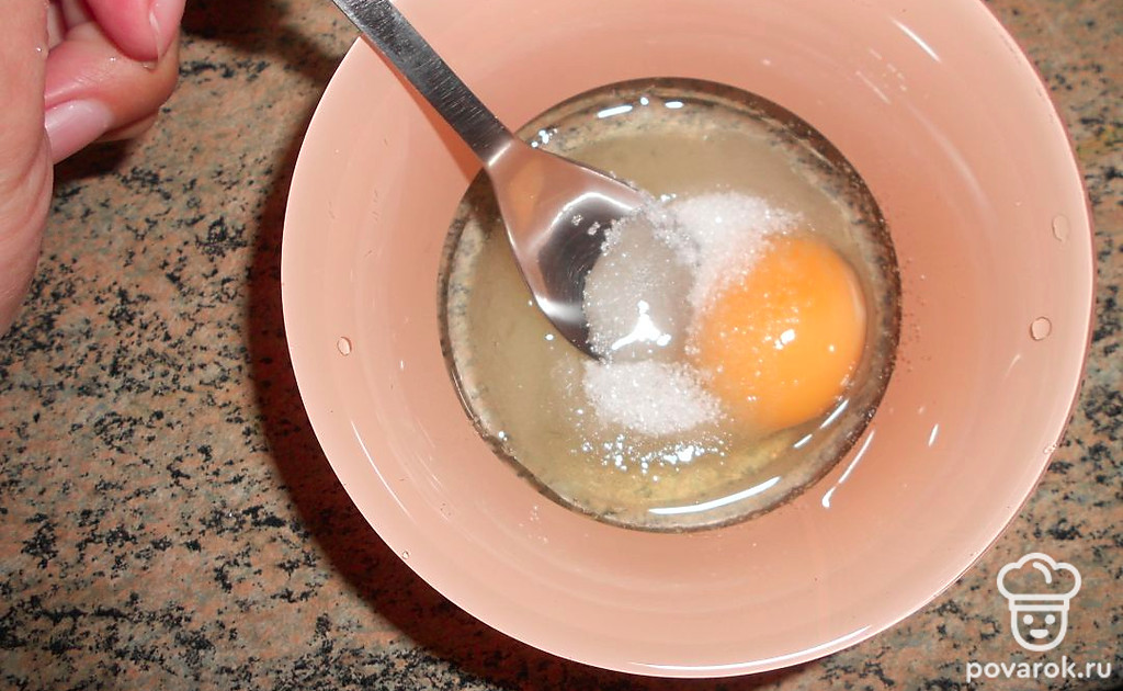 Одно яйцо С2 смешать с 2 столовыми ложками сахара. Сахара можно добавить меньше.