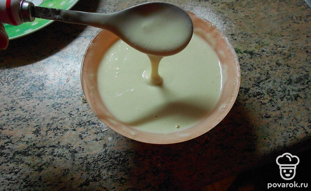 Хорошо размешать тесто, чтобы не было комочков. Вот так должно выглядеть тесто. Оно у меня жидкое, а не густое. Не забиваю тесто мукой!