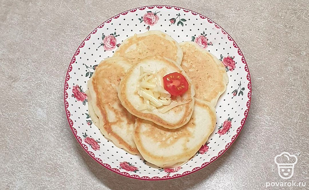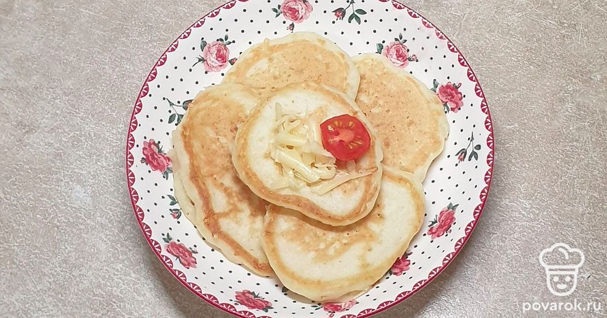 Очень вкусные оладьи с начинкой из тертого сыра. Пышные и румяные!