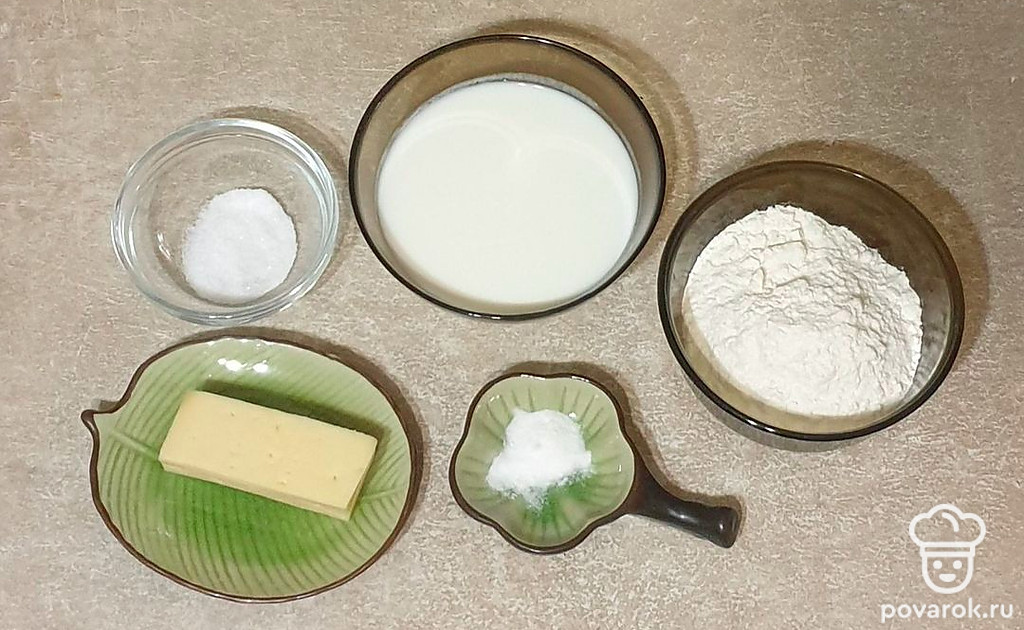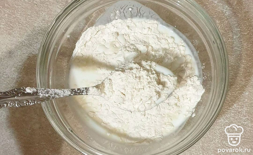 В миску влейте кефир и просейте муку с разрыхлителем и солью. Перемешайте.