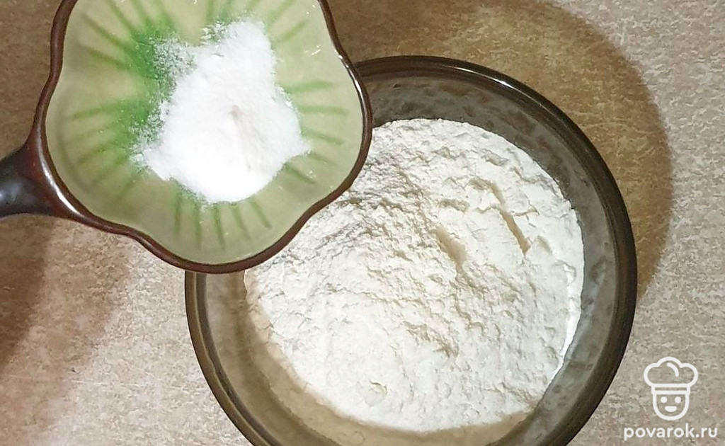 К муке добавьте разрыхлитель, соль и перемешайте.