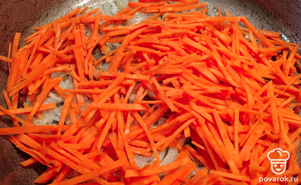 На раскаленной сковороде с растительным маслом обжарьте нарезанные лук и морковь.
