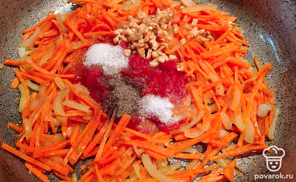 Добавьте томатную пасту, соль, сахар, перец, нарезанный чеснок. Перемешайте.