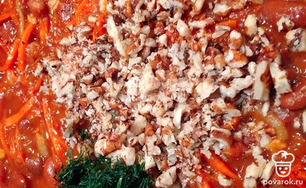 В сковороду добавьте орехи, зелень. Перемешайте, тушите 3 минуты. Выключите огонь, дайте постоять 5 минут под крышкой.