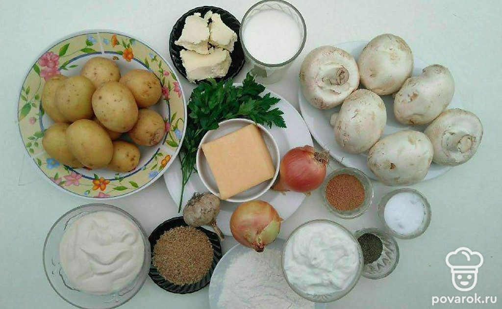 Молочные ингредиенты заранее выньте с холодильника, чтобы они были комнатной температуры. Картошку очистите и промойте. Грибы почистите и помойте. Лук очистите.