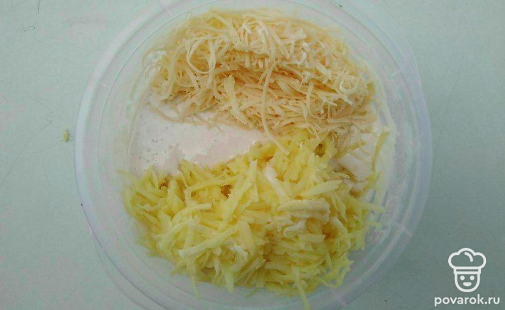 В глубокой емкости смешайте йогурт, молоко, сметану и муку. Хорошо перемешайте и добавьте натертый на крупной терке картофель и сыр. Посолите, поперчите по вкусу.