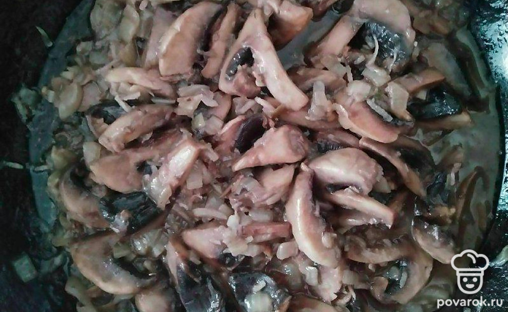 Лук обжарьте на сливочном масле и через 5 минут добавьте нарезанные небольшими кусочками грибы и измельченный чеснок. Обжарьте еще 10-15 минут.