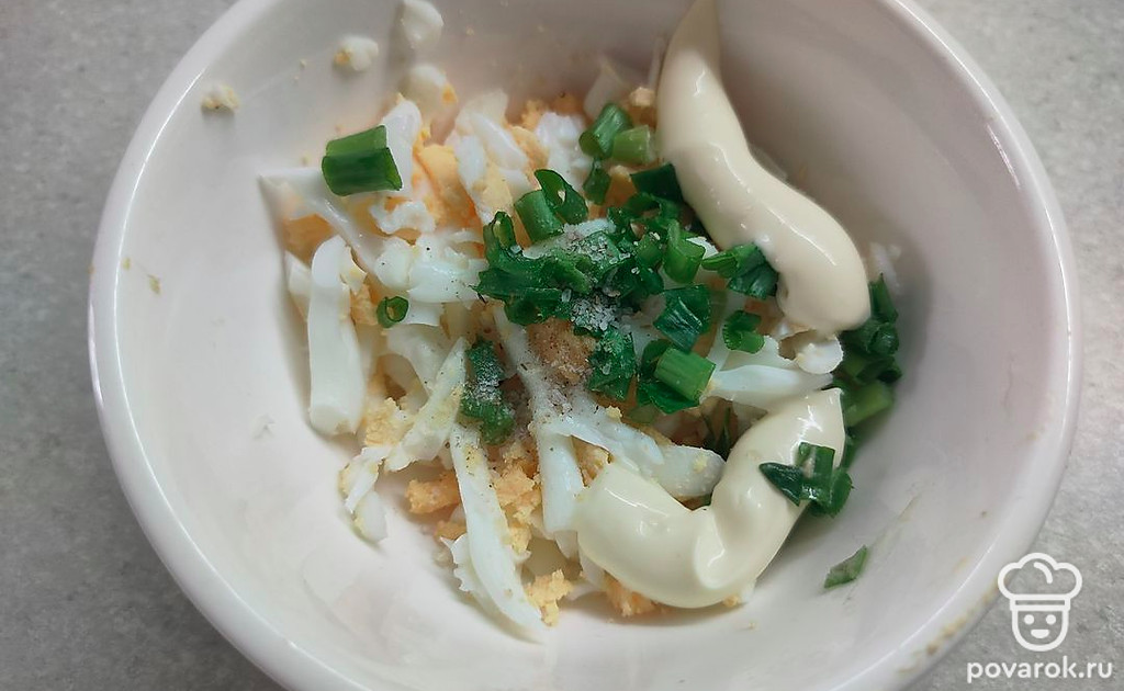 Приготовьте начинку. Яйца натрите на крупной терке. Зеленый лук измельчите. Соедините яйца, лук, соль, майонез и перемешайте.