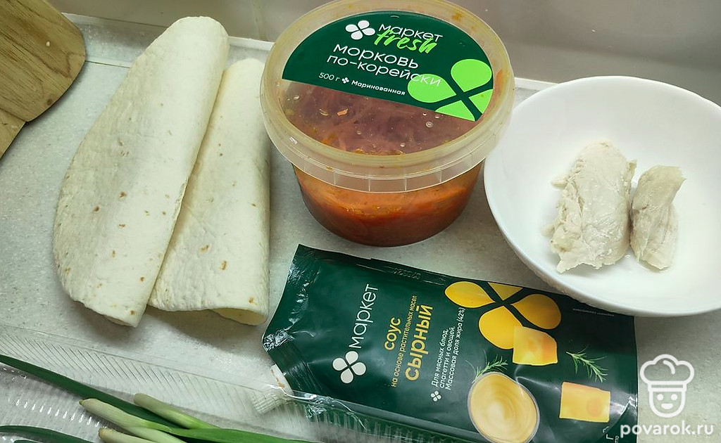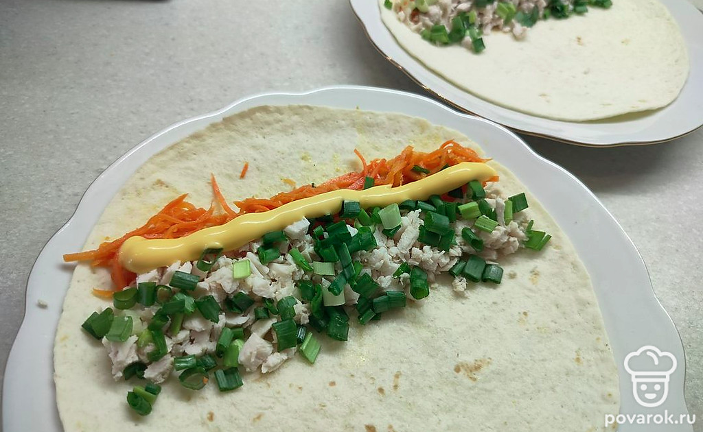 На каждую лепешку выложите начинку: корейскую морковь, зеленый лук, куриное филе и сырный соус.
