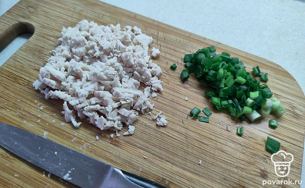 Лук измельчите. Курицу мелко нарежьте.