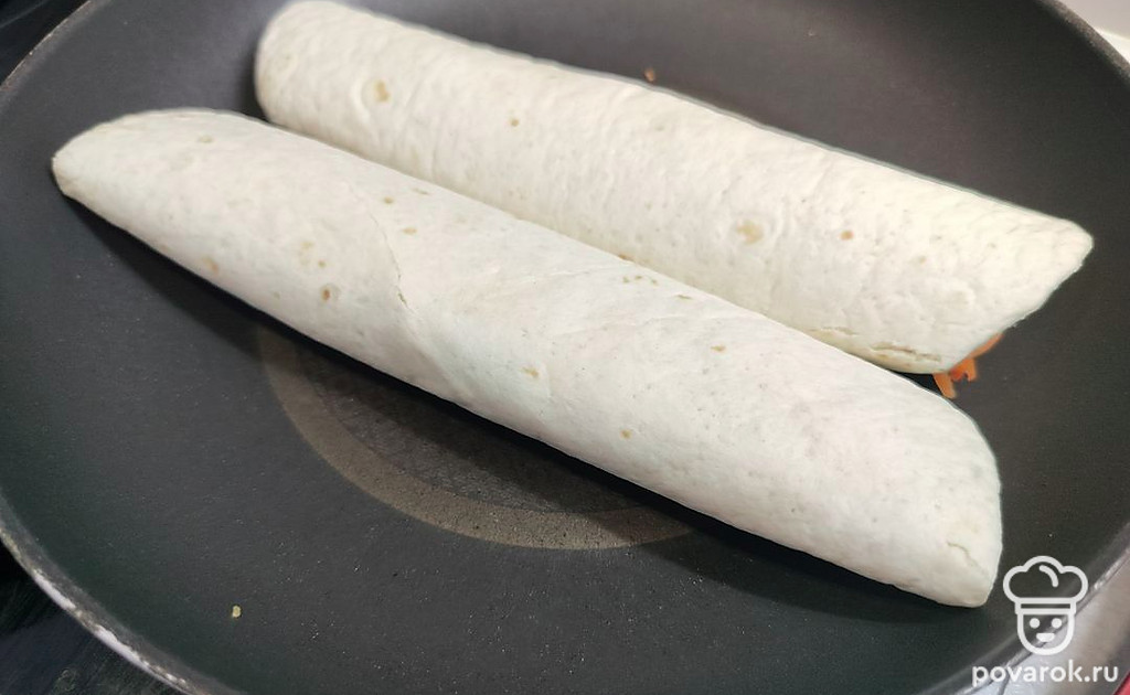 Сверните шаурму рулетом. Разогрейте на сковороде с двух сторон.