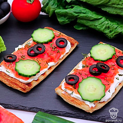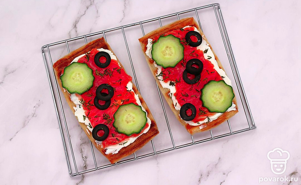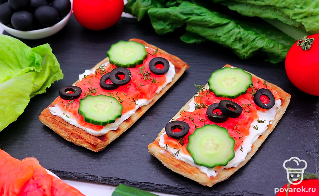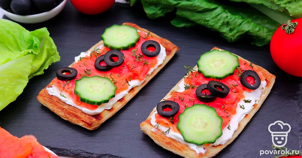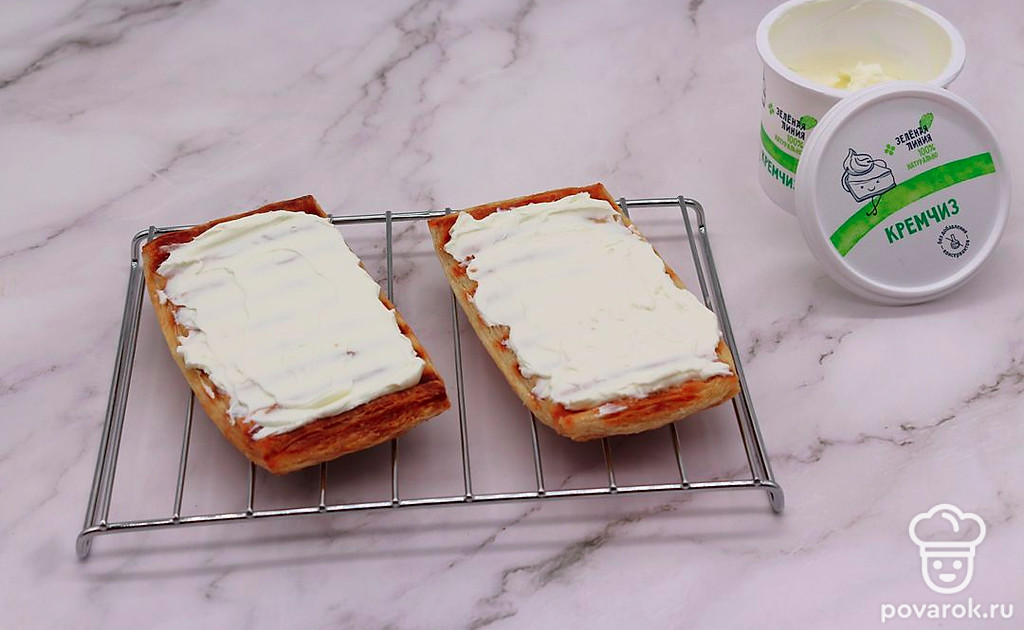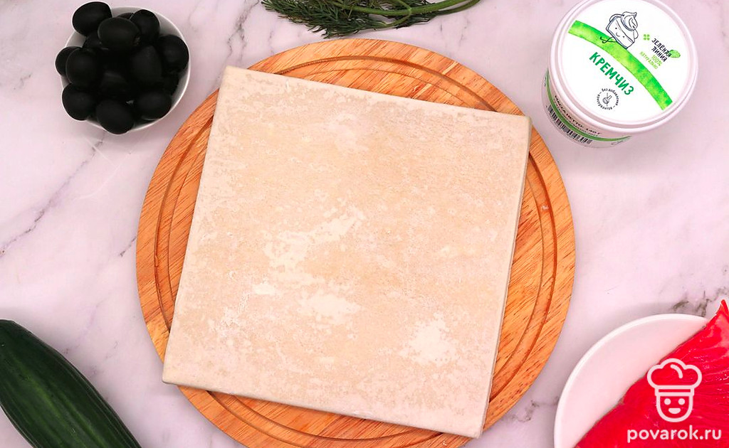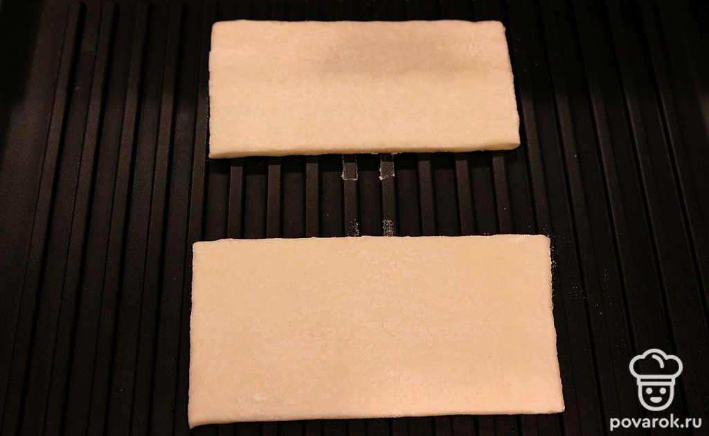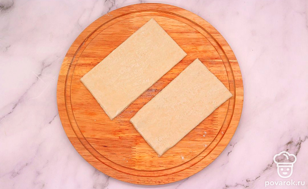 Разморозьте слоеное тесто согласно инструкции на упаковке. Затем тесто немного раскатайте и нарежьте на прямоугольники.