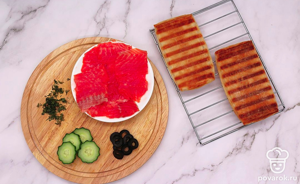 Разогрейте электрогриль. Выложите на него кусочки теста на расстоянии друг от друга. Накройте крышкой, готовьте ориентировочно минут 7. Точное время зависит от мощности устройства. Готовые основы остудите на решетке.