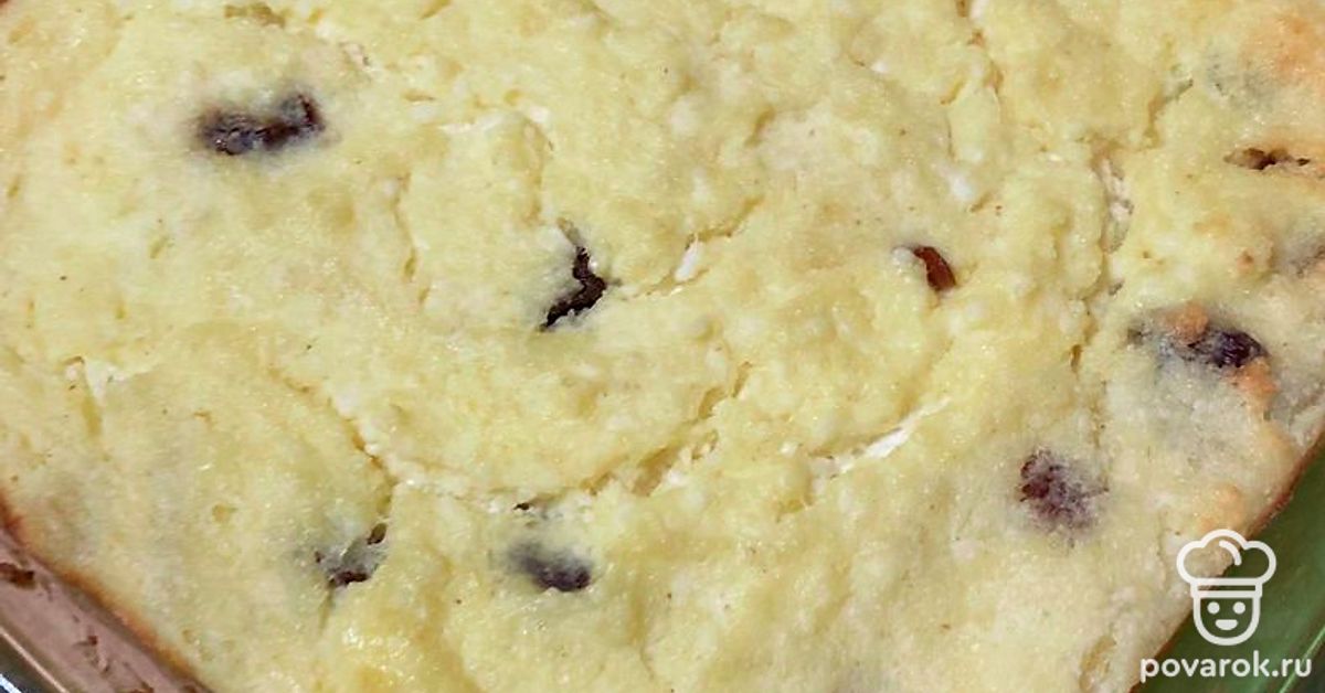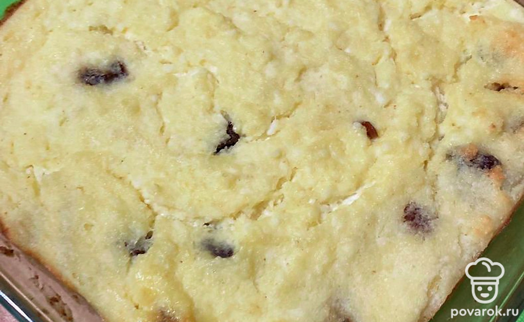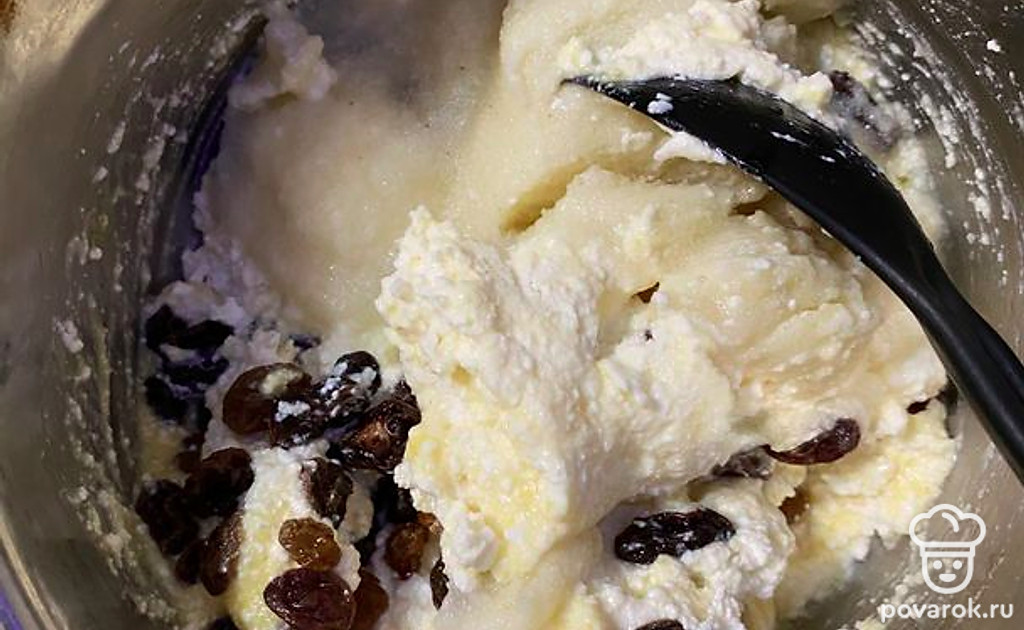 В творог добавить яйцо, сахар. Вылить воду из манки и изюма, остатки добавить в смесь с творогом.