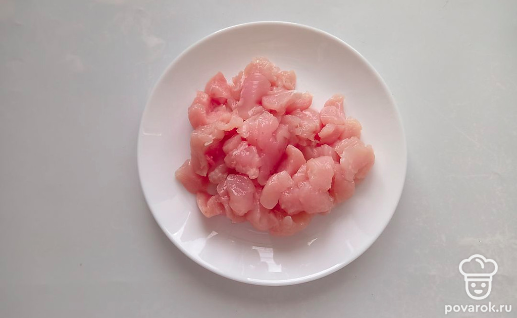 Нарезать кубиком куриную грудку, натереть сыр на крупной терке.