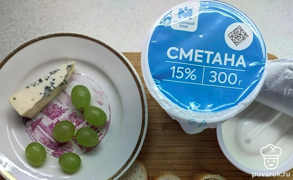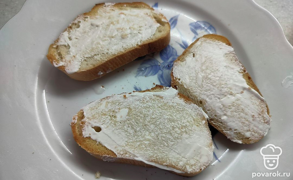 Из ломтиков батона приготовьте гренки. Обжарьте на сухой сковороде или в тостере. Смажьте их тонким слоем сметаны.