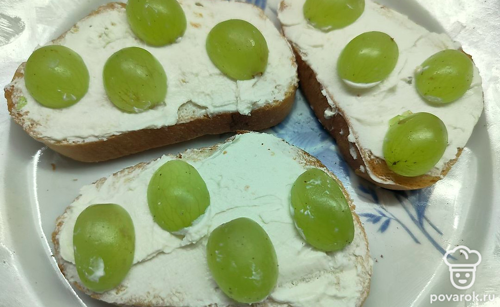 Следующим слоем распределите творожный сыр. Разложите разрезанный пополам виноград.