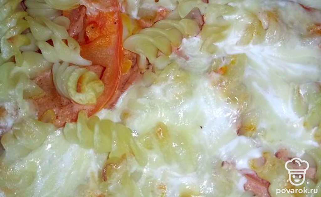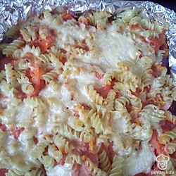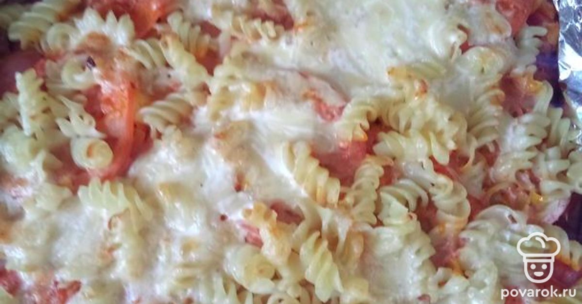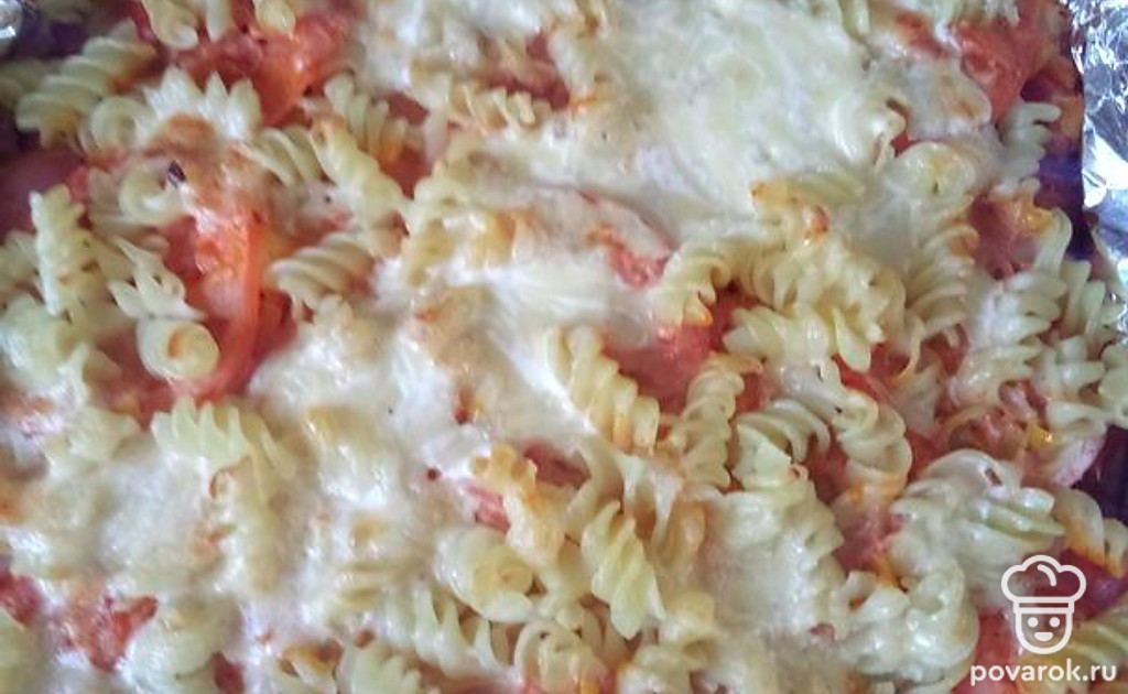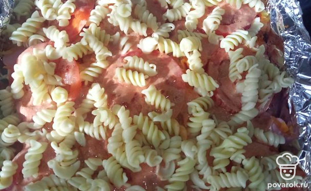 Режем помидор, выкладываем в форму, заливаем соусом и сверху выкладываем оставшиеся макароны.