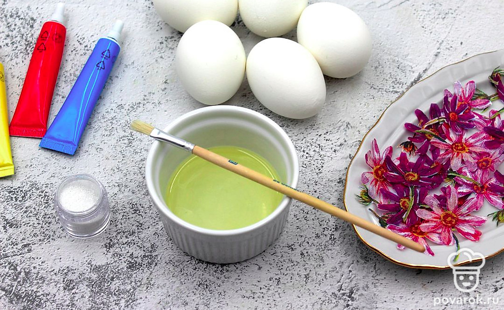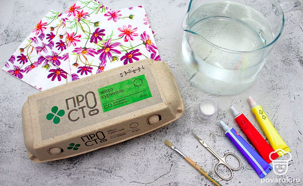 Подготовьте все ингредиенты. Возьмите яйца белого цвета категории СО, поскольку аппликацию удобно располагать на крупных яйцах. В качестве натурального клея можно использовать яйца коричневого или белого цвета категории С1-С2. Достаньте яйца из холодильника заранее, дайте им согреться до комнатной температуры. Вам также понадобится вода, салфетки с ярким рисунком, маникюрные ножницы, кисточка, блестки и красители.