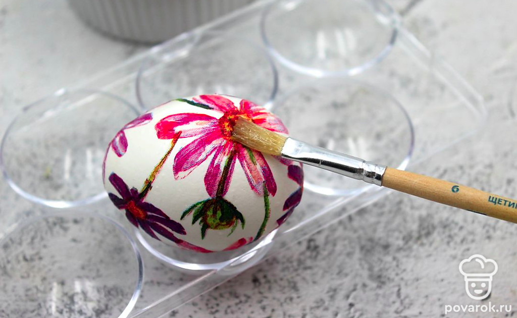 Возьмите первый фрагмент рисунка, приложите его к остывшему яйцу, а сверху кисточкой нанесите в один слой яичный белок. Сделайте декупаж всех яиц. Дайте просохнуть наклеенным рисункам.
