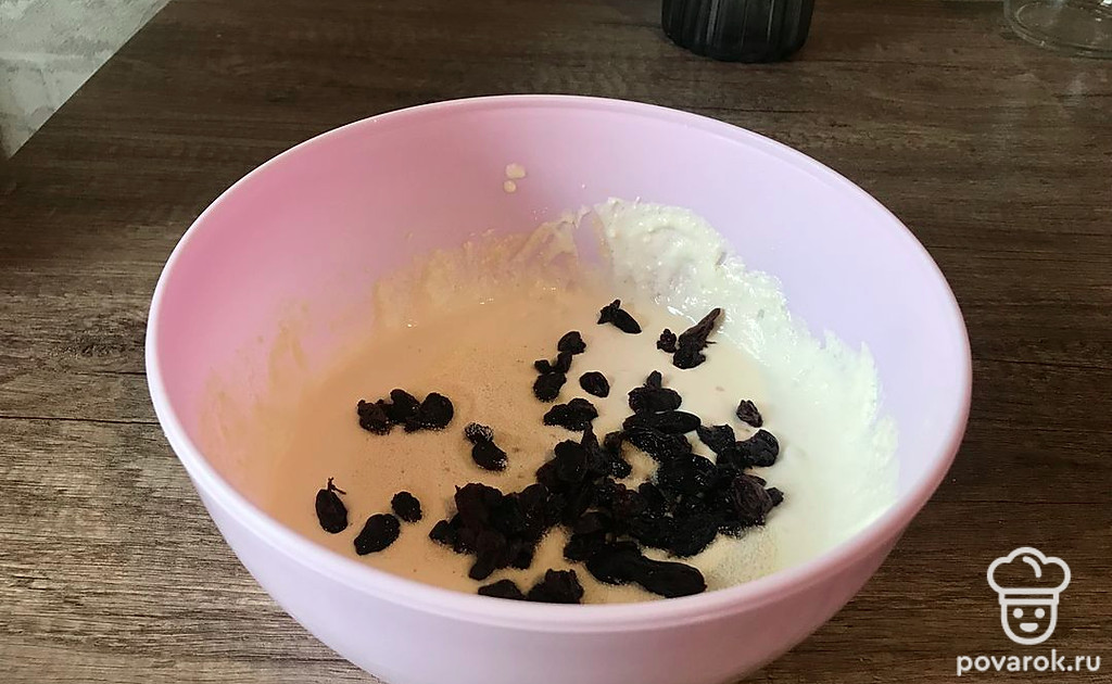 И 3 столовых ложки предварительно замоченного в кипятке изюма. Перемешайте массу.