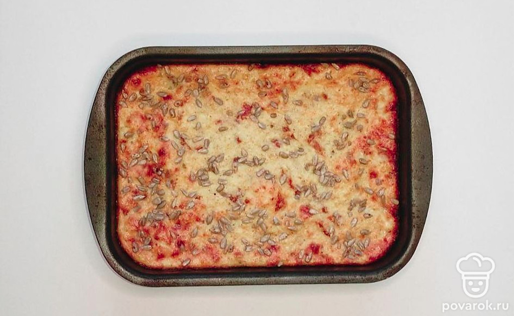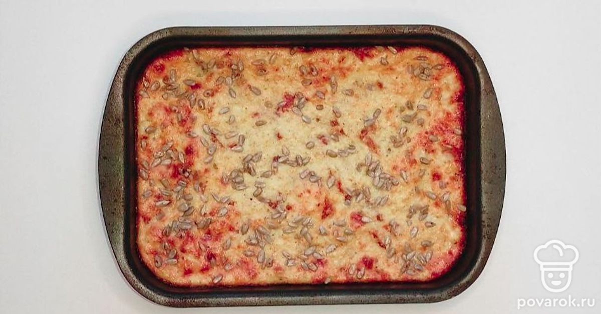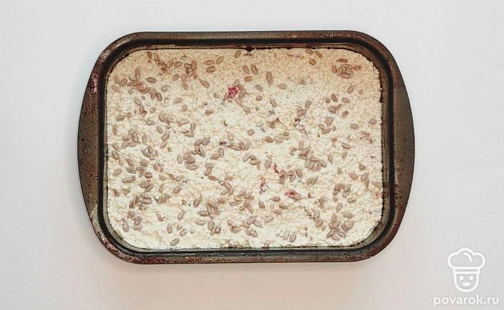 Добавьте сухофрукты в тесто и перемешайте, сверху. Смажьте форму для выпекания растительным маслом и переложите в нее заготовку. Посыпьте верху семечками. Поместите в духовку на 30 минут.