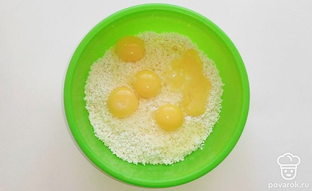 Поместите творог в миску и разотрите его, чтобы не было крупных комков, добавьте яйца. Все тщательно перемешайте. Добавьте цельнозерновую муку, соль и немного ванилина для аромата. Размешайте тесто.