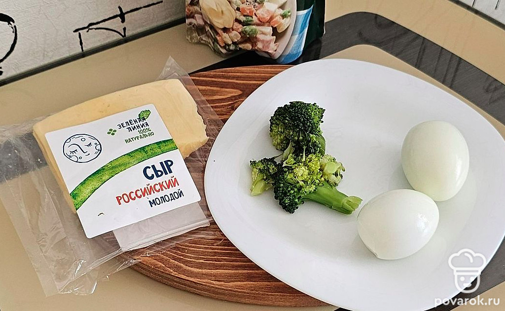 Подготовьте все ингредиенты. Брокколи отварите в подсоленной воде 5 минут. Сварите яйца.