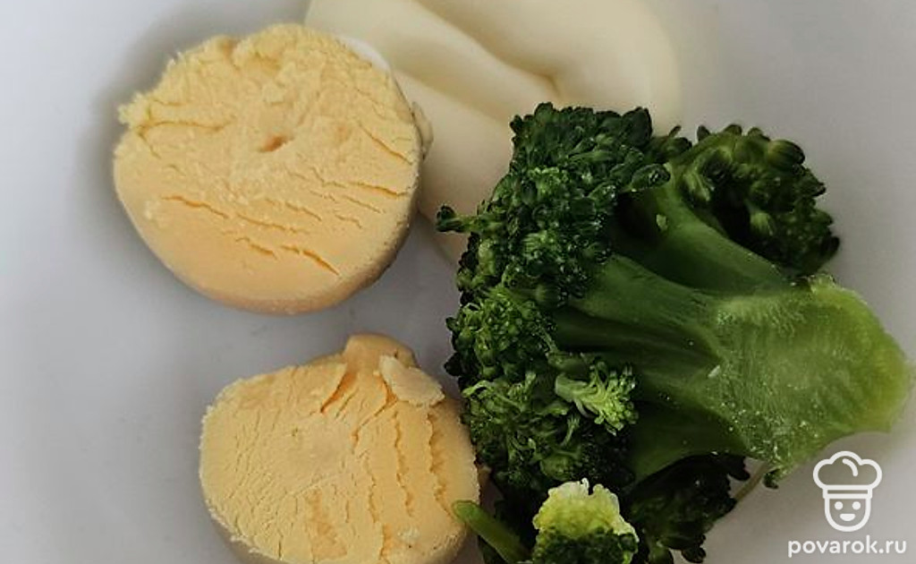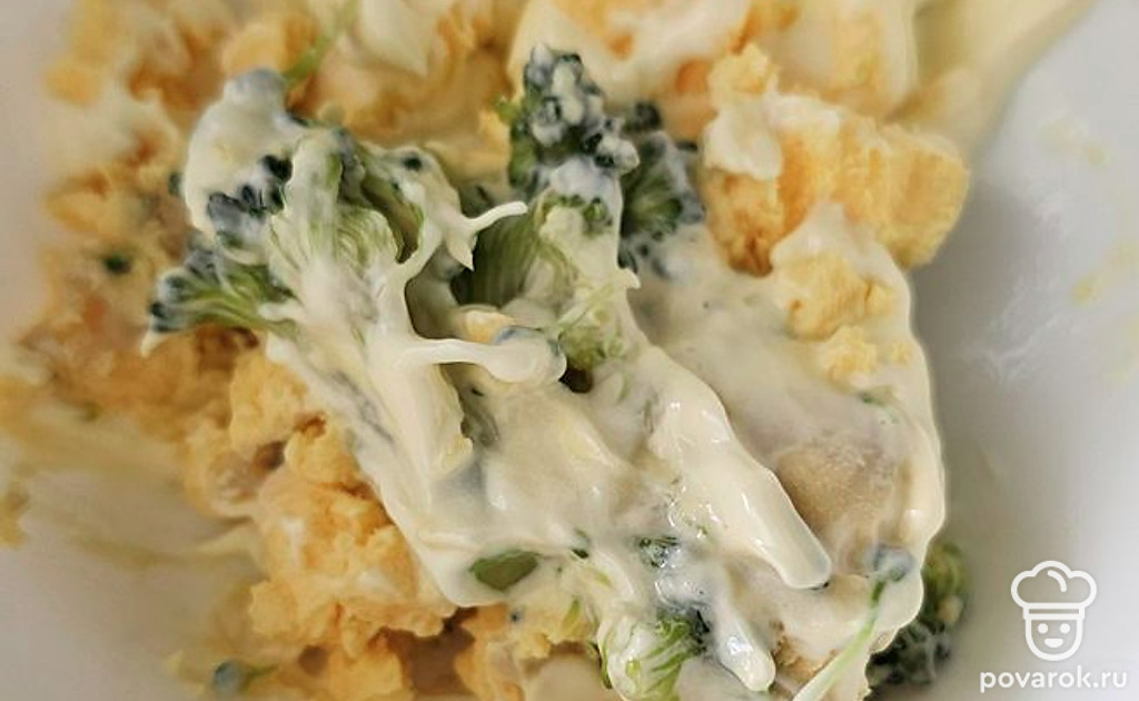 Желток, брокколли и майонез соедините. Желток и капусту разомните вилкой. Добавьте майонез, перемешайте.