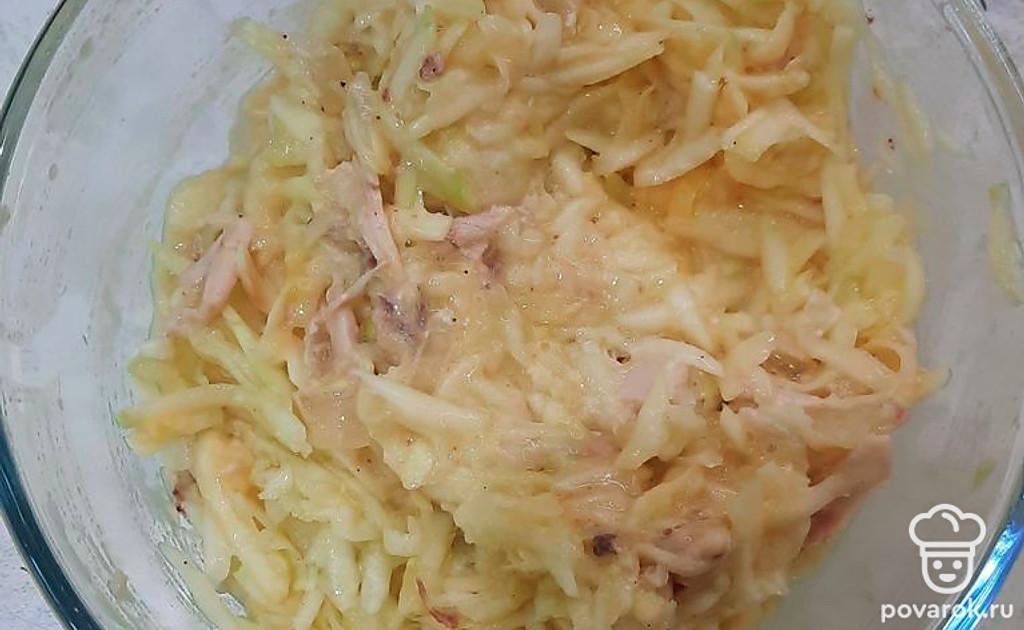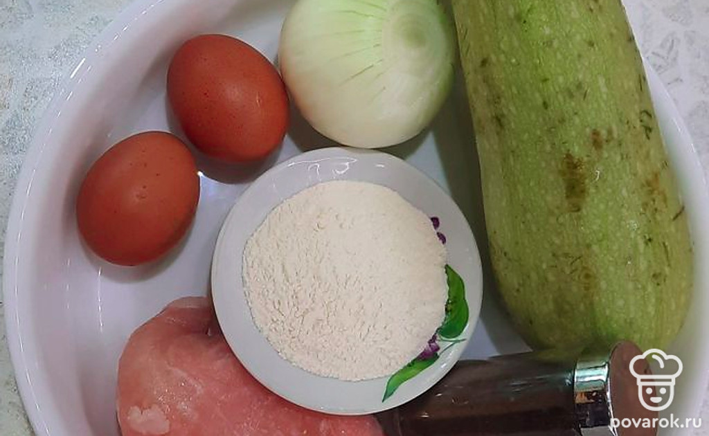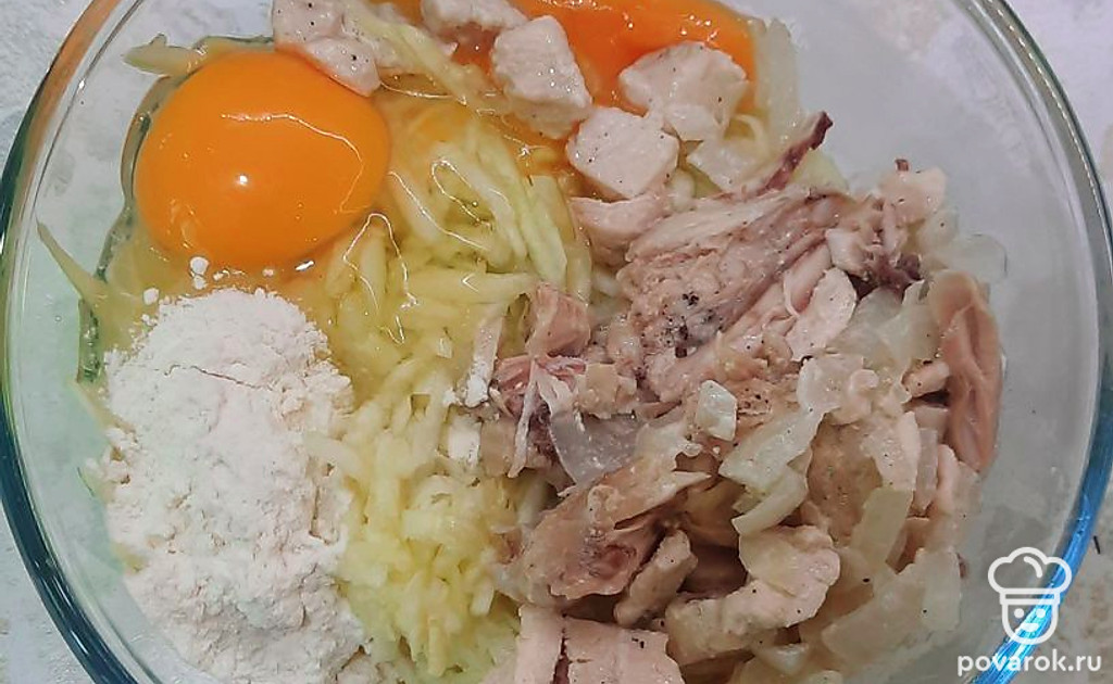 Натереть кабачок. Порезать куриную. Порезать лук.