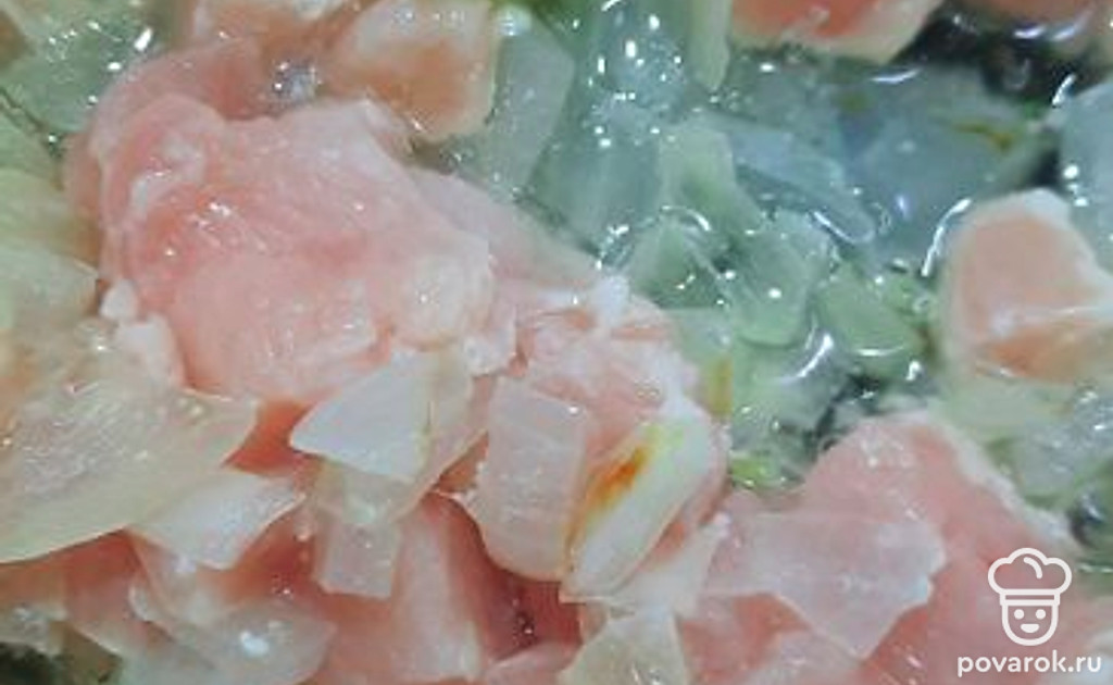 Обжарить лук и грудку.