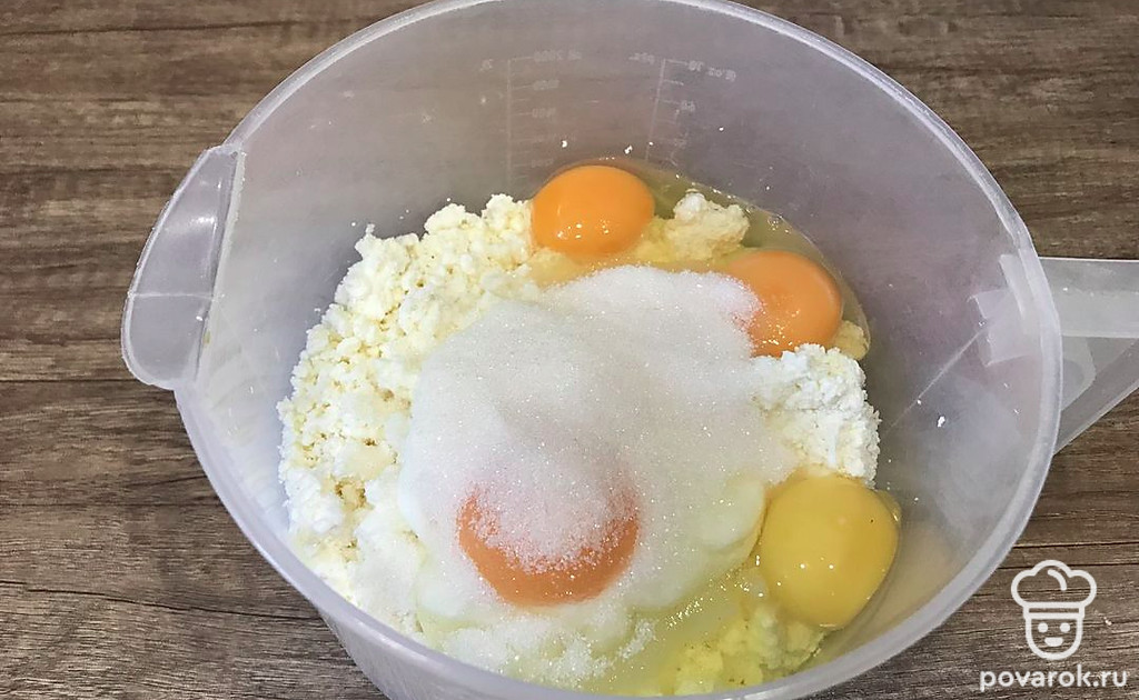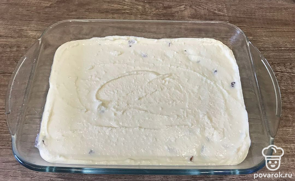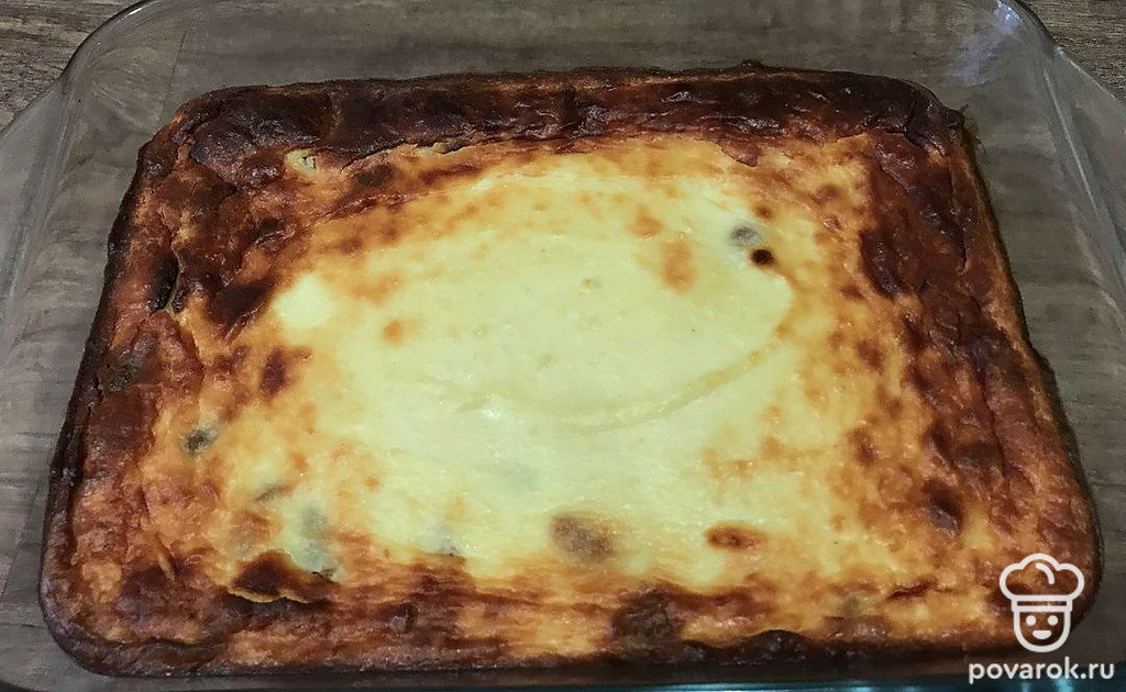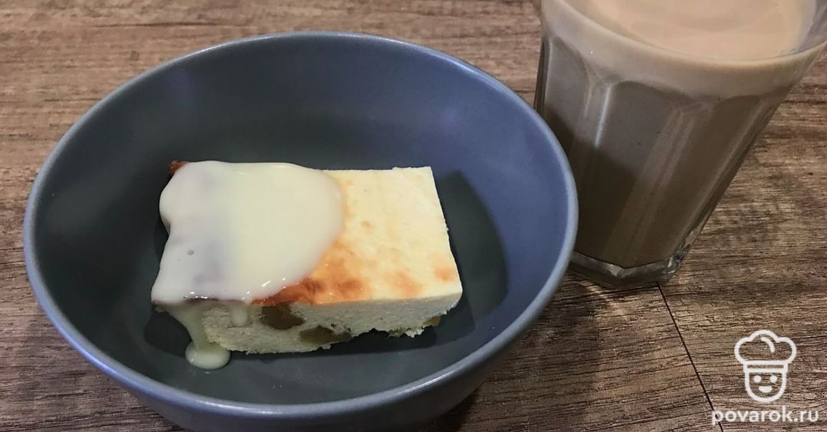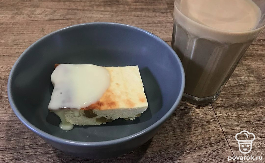 Запеканка получается нежная, в ней много творога. Подавайте обязательно со сгущенным молоком.