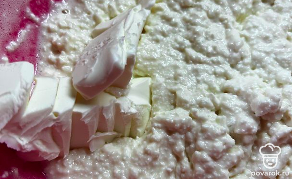 К творогу с яйцами выкладываем теплое сливочное масло.