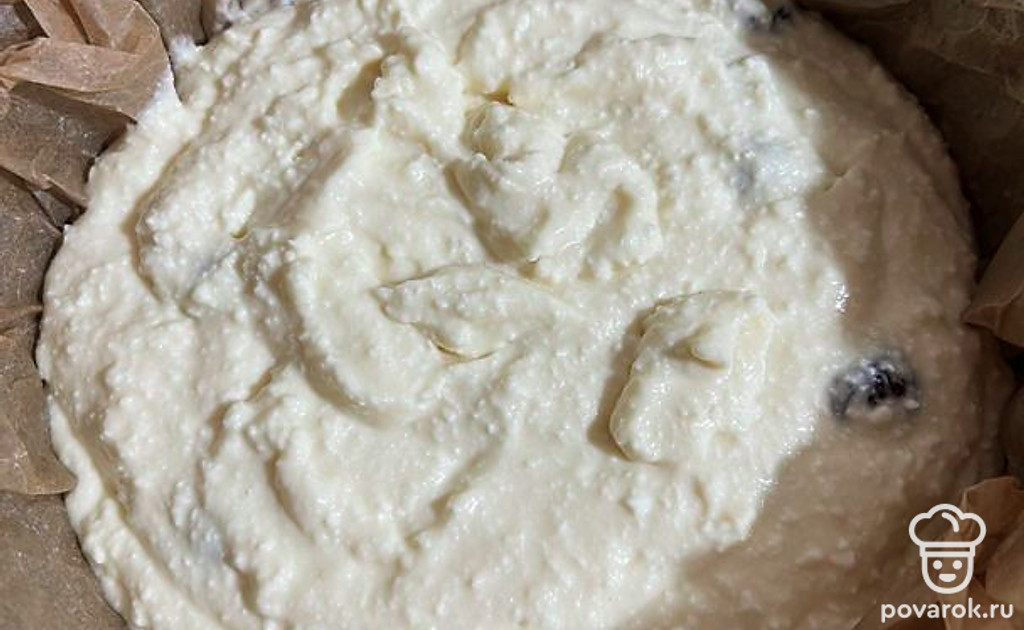 Добавляем к яичной смеси творог. Желательно творог заранее проблендерить, чтобы он был как творожная масса.