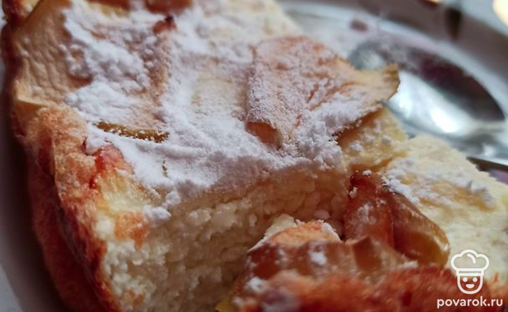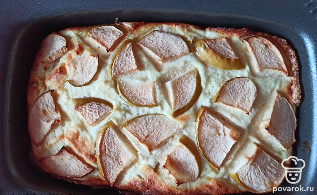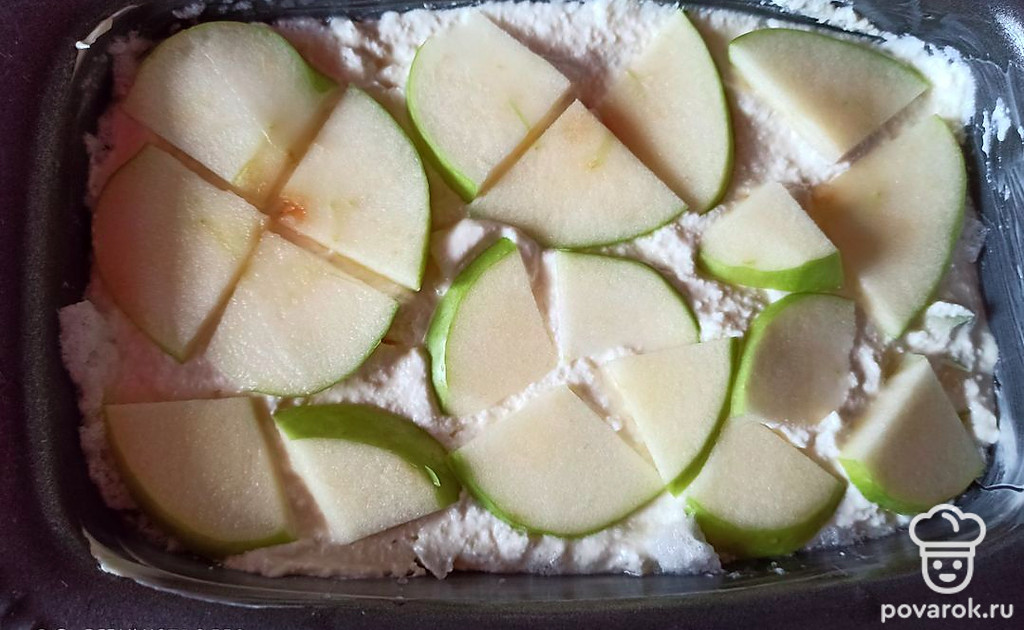 Творожную массу выложить в форму для запекания, украсить яблоками. Запекать при температуре 160 градусов в течение 40-45 минут.