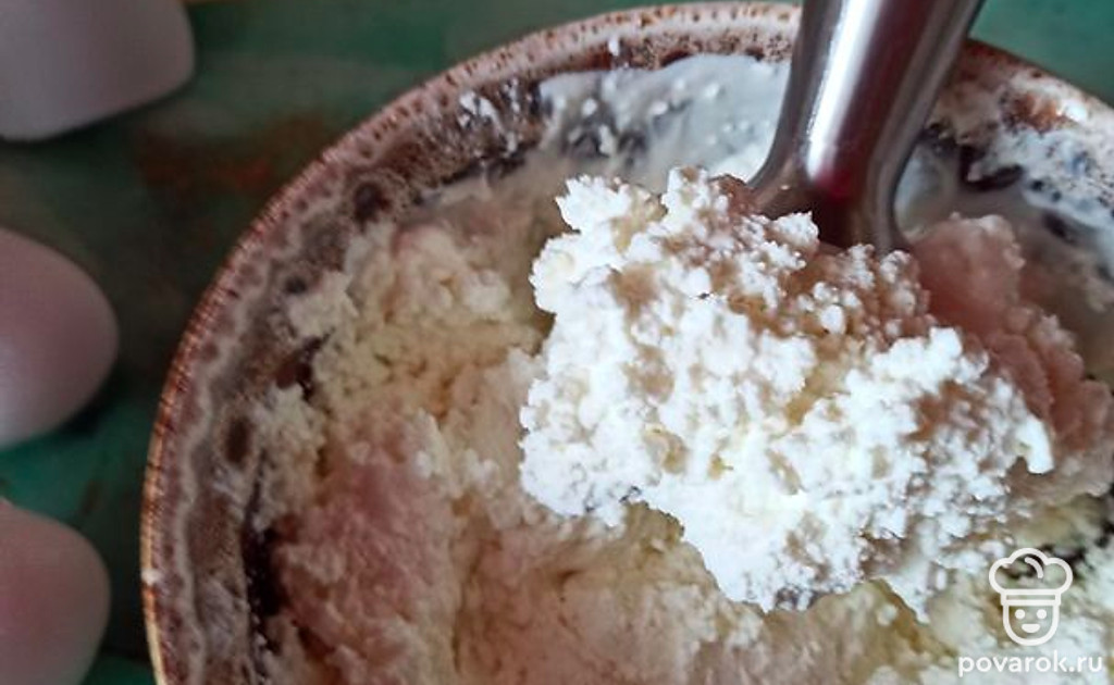 С помощью блендера творог перемешать. Добавить сметану, манную крупу, нарезанные яблоки. Все тщательно размешать.