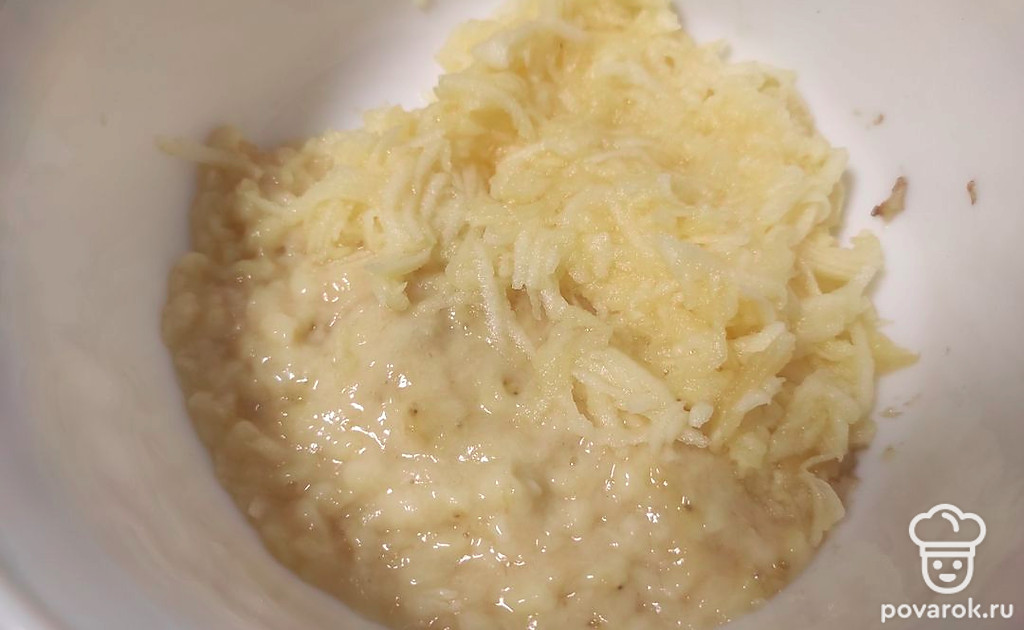 Банан размять вилкой до состояния пюре, яблоко почистить от кожуры и семян и натереть на крупной терке.